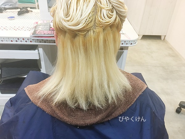 ブリーチは1回です。やや、根元に赤みが残っているように見えますが、まったくモウマンタイ。