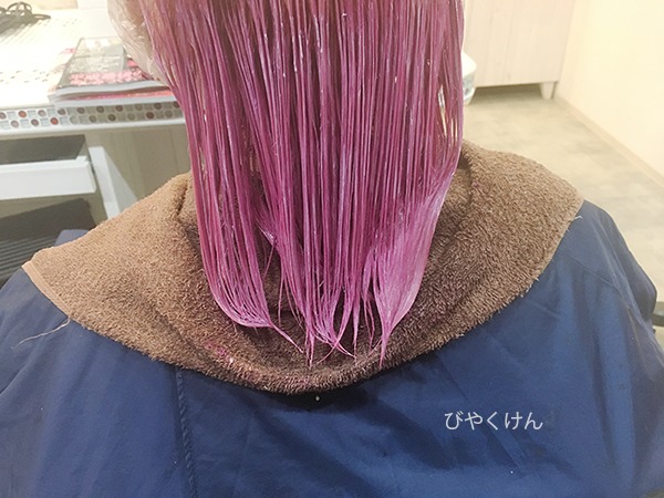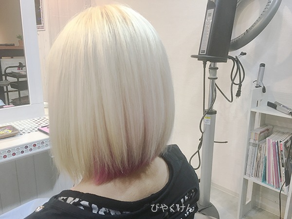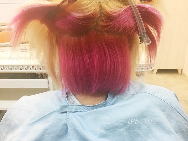 施術工程は、根元をブリーチリタッチ。アンダーの濁りをブリーチシャンプーで抜いてアンダーセクションにピンクを原液のまま塗布してみたいと思います。